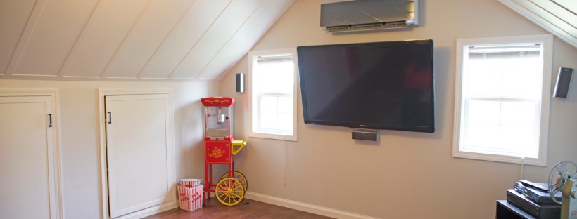 The space, approximately 400 square feet of once completely unfinished attic, is now a movie room, a long hallway that we use as a gallery for family portraits, and an office space. The office space was J.T.’s idea. When we learned we were expecting Eva, Pamela had to give up her office space in the third bedroom for Eva’s nursery. Now, Pamela has a small office with a ton of storage built into the walls.
