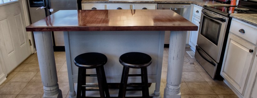 The island was actually constructed from an antique cabinet I purchased at an antique store. J.T. took the door off the front and inserted the microwave, then installed an outlet in the floor to plug the microwave in. The island was brought up to counter height with a shelf and decorative wooden casters.
