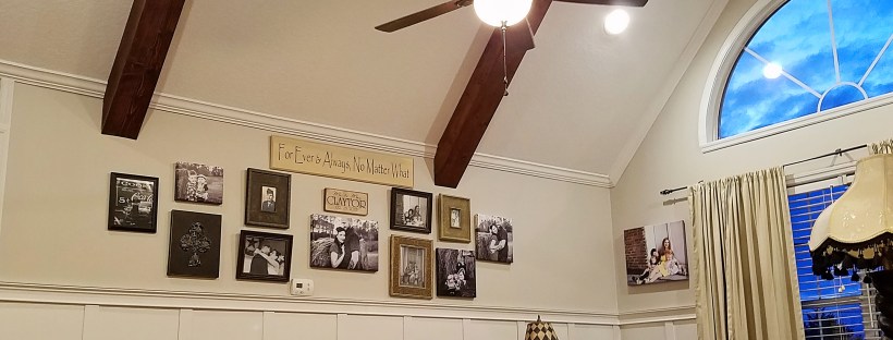 Then for Christmas this year my gift was ceiling beams and recessed lighting. The room was super dark at night, as there is just the one ceiling fan light in the middle of the room. Now, with the addition of four tilting can lights made for vaulted ceilings, we can FINALLY see!